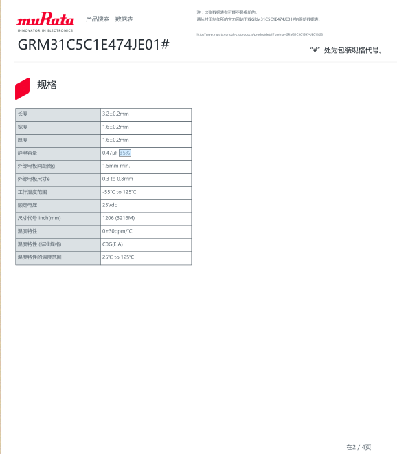 GRM31C5C1E474JE01L 1206 474J 50V C0G 1.6mm